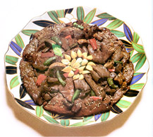 ◇ 牛のレバー…400g ◇ 青唐辛子…30g ◇ 赤唐辛子…30g ◇ ニンニク…・30g ◇ マッシュルーム…30g ◇ 醤油…大さじ3 ◇ 砂糖…小さじ1/2 ◇ 水…大さじ5 ◇ サラダ油…小さじ1/2 ◇ 胡椒…小さじ1/6 ◇ 化学調味料…小さじ1/6 ◇ 胡麻…小さじ1/2 |